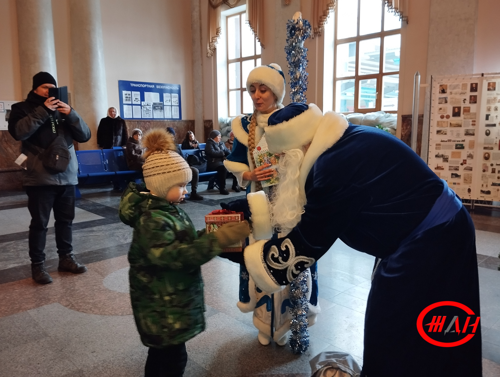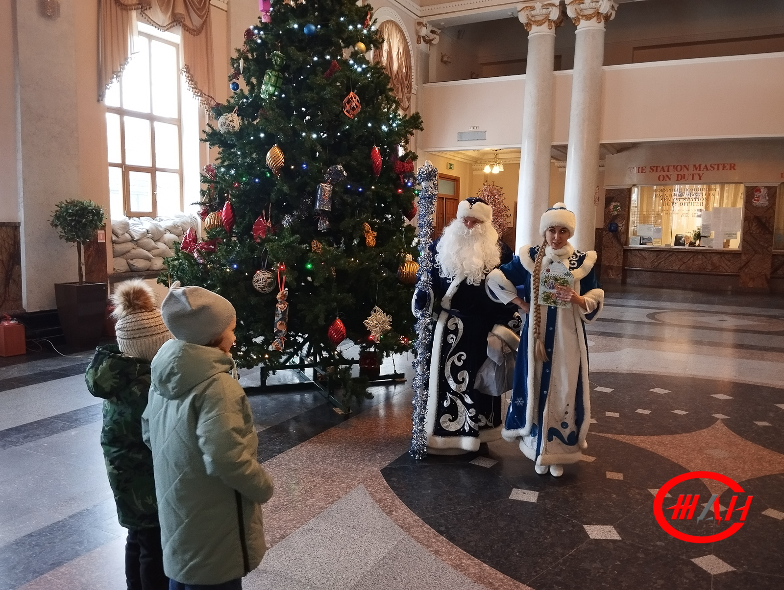 Ярким продолжением праздника стала встреча с Дедом Морозом и Снегурочкой у нарядно украшенной елки на железнодорожном вокзале Донецк. Ребята наперебой отвечали на вопросы железнодорожной тематики. В награду они получили сладкие подарки и билеты на будущую поездку по детской железной дороге.